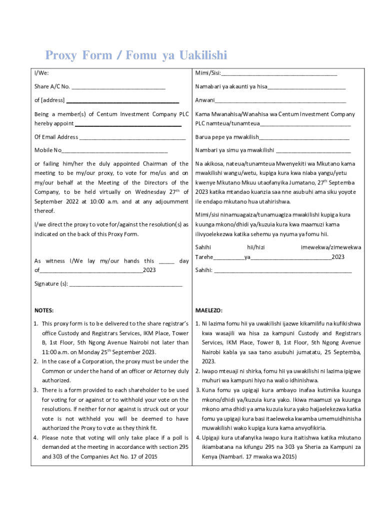 Proxy Form / Fomu ya Uakilishi I/We:Mimi/Sisi:___Share A/C No. ___Namabari ya akaunti ya hisa___of [address] ___Anwani___Being a member(s) of Centum Investment Company PLC hereby appoint ___Kama Mwanahisa/Wanahisa
