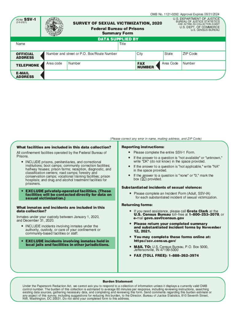 OMB No. 11210292: Approval Expires 08/31/2024 U.S. DEPARTMENT OF JUSTICESSV1FORM (392021)BUREAU OF JUSTICE STATISTICSSURVEY OF SEXUAL VICTIMIZATION, 2020 Federal Bureau of Prisons Summary FormAND
