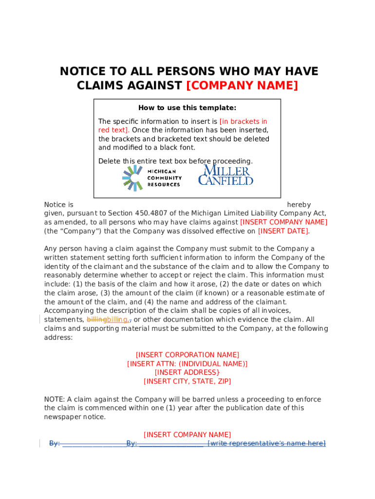 Template notice to all persons who may have claims against... instructions