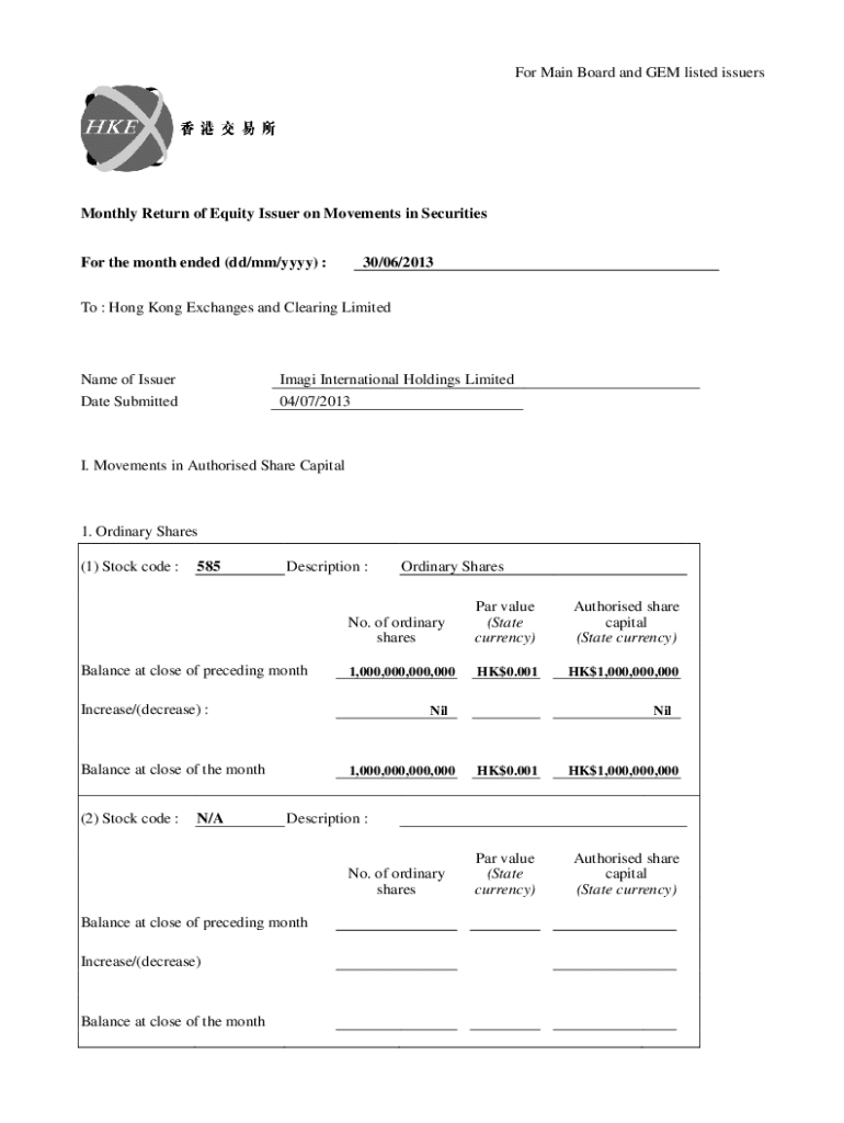 For Main Board and GEM listed issuersMonthly Return of Equity Issuer on Movements in Securities For the month ended (dd/mm/yyyy) :30/06/2013To : Hong Kong Exchanges and Clearing LimitedName of Issuer
