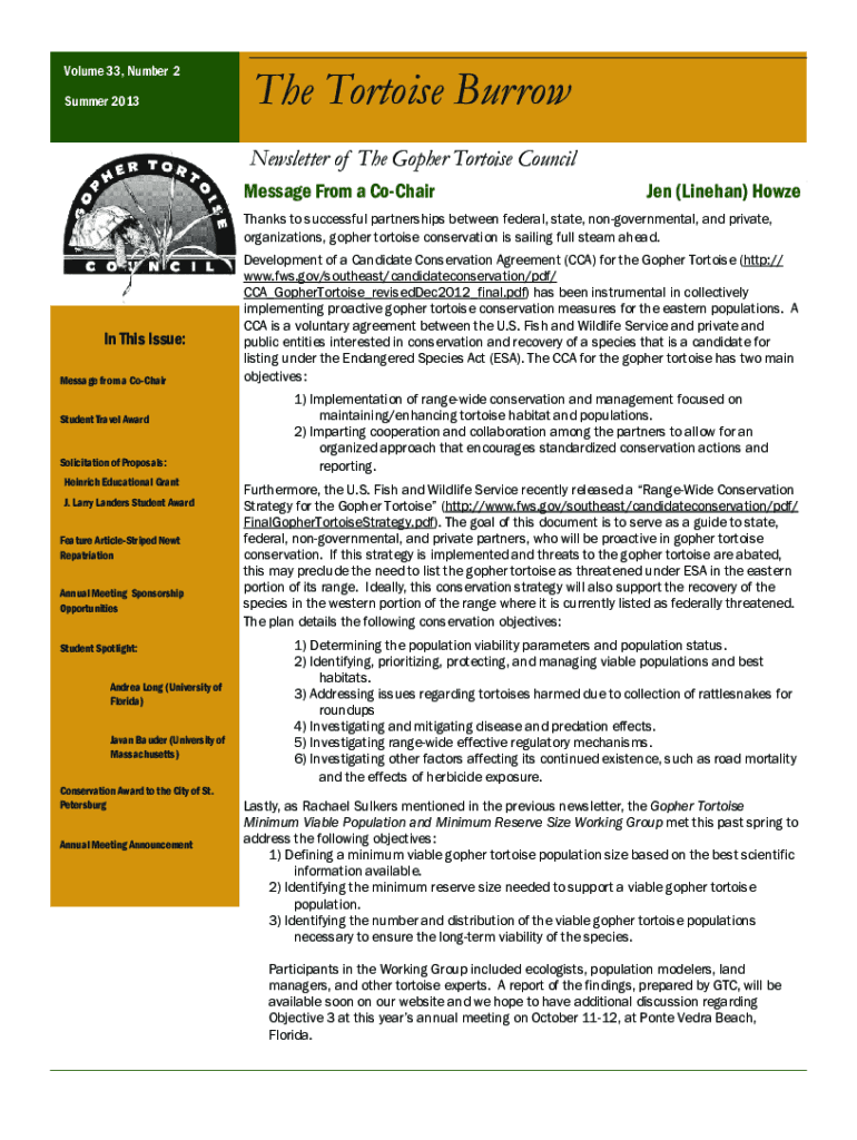 Volume 33, Number 2 Summer 2013The Tortoise Burrow Newsletter of The Gopher Tortoise Council Message From a CoChairJen (Linehan) HowzeThanks to successful partnerships between federal, state, nongovernmental,