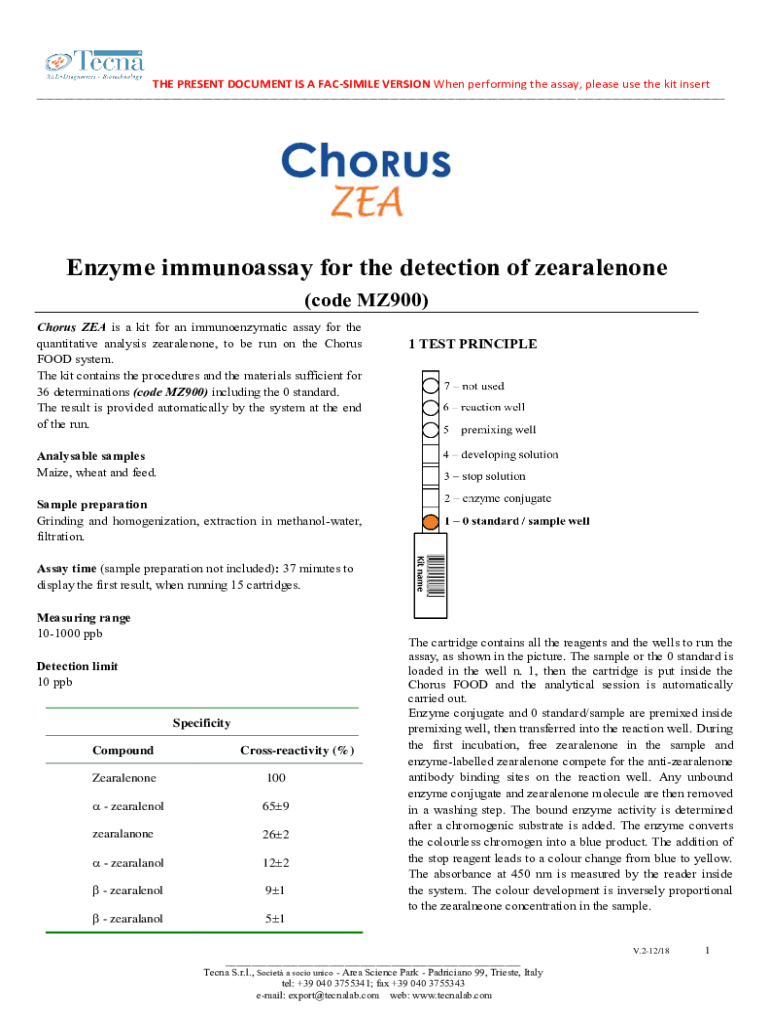 THE PRESENT DOCUMENT IS A FACSIMILE VERSION When performing the assay, please use the kit insert ___ ___Enzyme immunoassay for the detection of zearalenone (code MZ900) Chorus ZEA is a kit for an