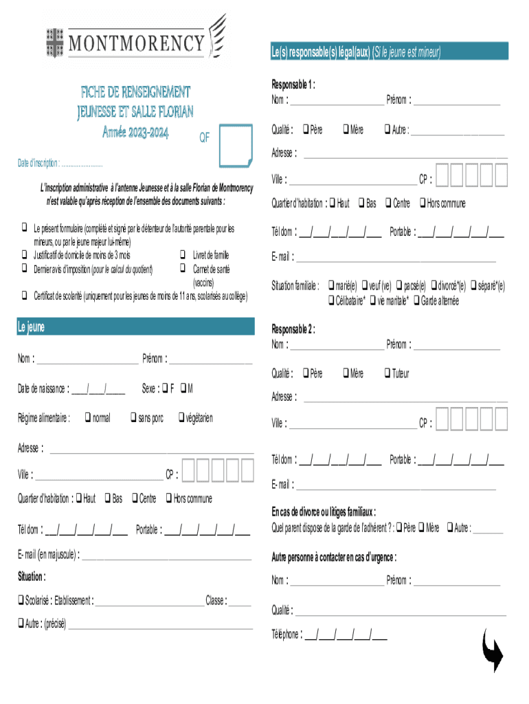 Le(s) responsable(s) lgal(aux) (Si le jeune est mineur)FICHE DE RENSEIGNEMENT JEUNESSE ET SALLE FLORIAN Anne 20232024 Date dinscription : Responsable 1 : Nom : ___ Prnom : ___ QF : de Montmorency