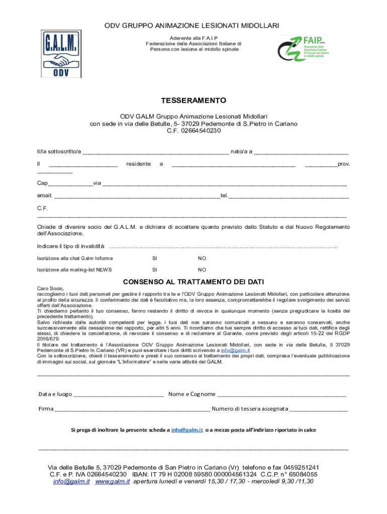 ODV GRUPPO ANIMAZIONE LESIONATI MIDOLLARI Aderente alla F.A.I.P Federazione delle Associazioni Italiane di Persone con lesione al midollo spinaleTESSERAMENTO ODV GALM Gruppo Animazione Lesionati Midollari
