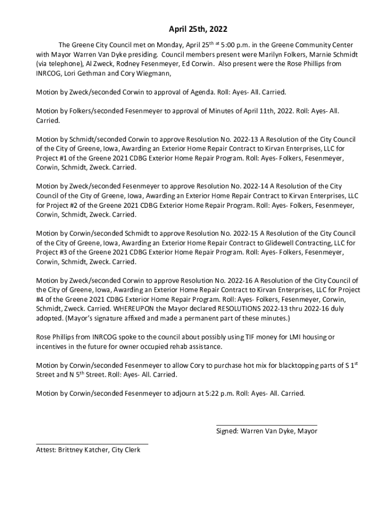 April 25th, 2022 The Greene City Council met on Monday, April 25th at 5:00 p.m. in the Greene Community Center with Mayor Warren Van Dyke presiding. Council members present were Marilyn Folkers, Marnie