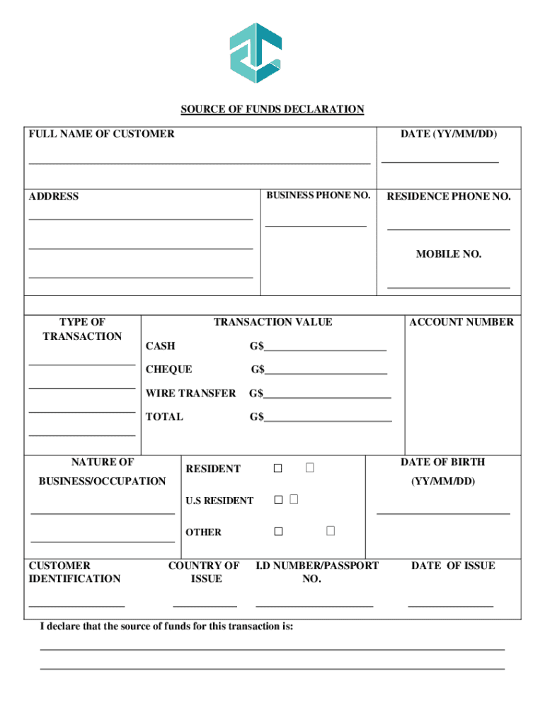 SOURCE OF FUNDS DECLARATION FULL NAME OF CUSTOMERDATE (YY/MM/DD) ______ ADDRESS ___BUSINESS PHONE NO.RESIDENCE PHONE NO._________ MOBILE NO. ___ ___TYPE OF TRANSACTION ___ ___ ___TRANSACTION VALUEACCOUNT