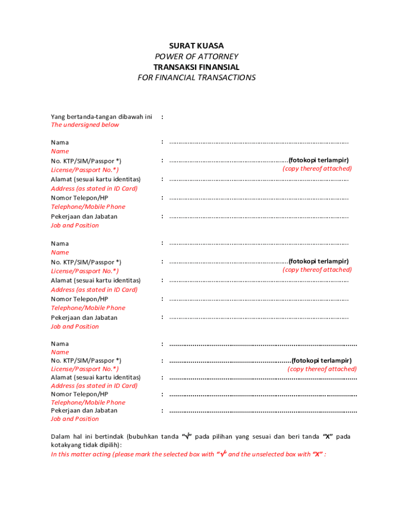 SURAT KUASA POWER OF ATTORNEY TRANSAKSI FINANSIAL FOR FINANCIAL TRANSACTIONSYang bertandatangan dibawah ini The undersigned below:Nama Name No. KTP/SIM/Passpor *) License/Passport No.*) Alamat (sesuai