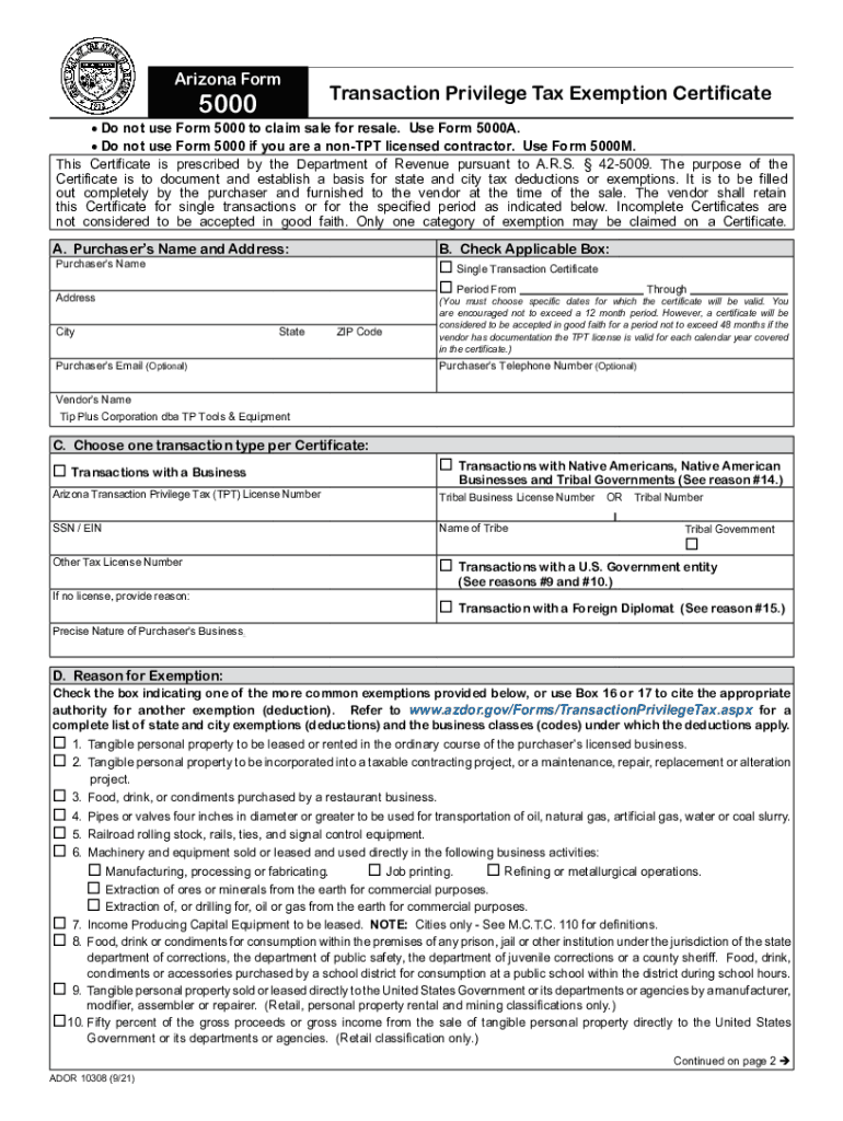 Arizona Form5000Transaction Privilege Tax Exemption Certificate Do not use Form 5000 to claim sale for resale. Use Form 5000A.