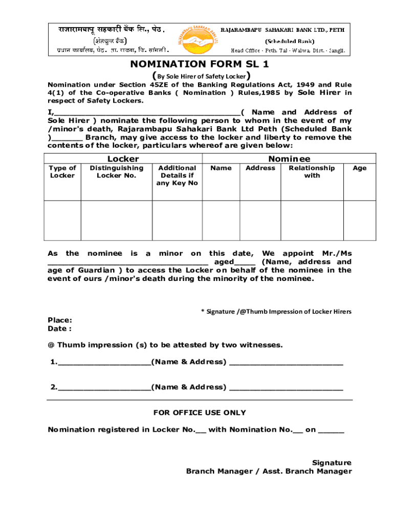 NOMINATION FORM SL 1 (By Sole Hirer of Safety Locker) Nomination under Section 45ZE of the Banking Regulations Act, 1949 and Rule 4(1) of the Cooperative Banks ( Nomination ) Rules,1985 by Sole Hirer
