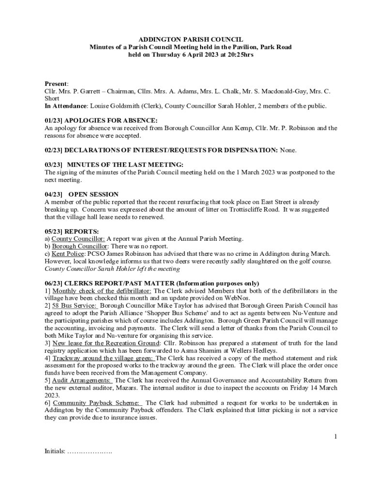 ADDINGTON PARISH COUNCIL Minutes of a Parish Council Meeting held in the Pavilion, Park Road held on Thursday 6 April 2023 at 20:25hrsPresent: Cllr. Mrs. P. Garrett Chairman, Cllrs. Mrs. A. Adams,