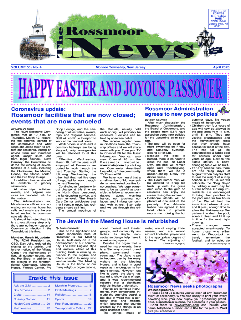 PRSRT STD ECRWSS U.S. Postage PAID EDDM Retail Monroe Twp., NJ 08831VOLUME 56 / No. 4Monroe Township, New JerseyCoronavirus update:Rossmoor facilities that are now closed; events that are now canceled