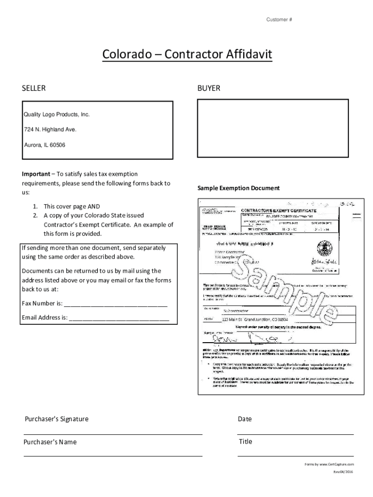 Customer #ColoradoContractorAffidavit SELLERBUYERQuality Logo Products, Inc. 724 N. Highland Ave. Aurora, IL 60506ImportantTosatisfysalestaxexemption requirements,pleasesendthefollowingformsbackto