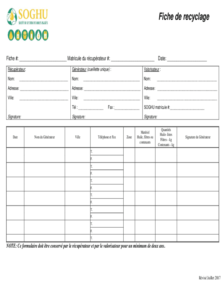 Fiche de recyclageFiche #: ___ Matricule du rcuprateur #: ___Date: ___Rcuprateur:Gnrateur (cueillette unique) :Valorisateur :Nom:Nom:Nom:_________Adresse: ___Adresse: ___Adresse: ___Ville:Ville:Ville:______Tl