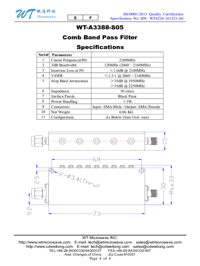 DISO9001:2015 Quality Certification Specification No DN: WT4224161221A0PWTA3388S05 Comb Band Pass Filter Specifications Serial 1 2 3 4 5 6 7 8 9 10 11Parameters Center Frequency(F0) 3dB Bandwidth