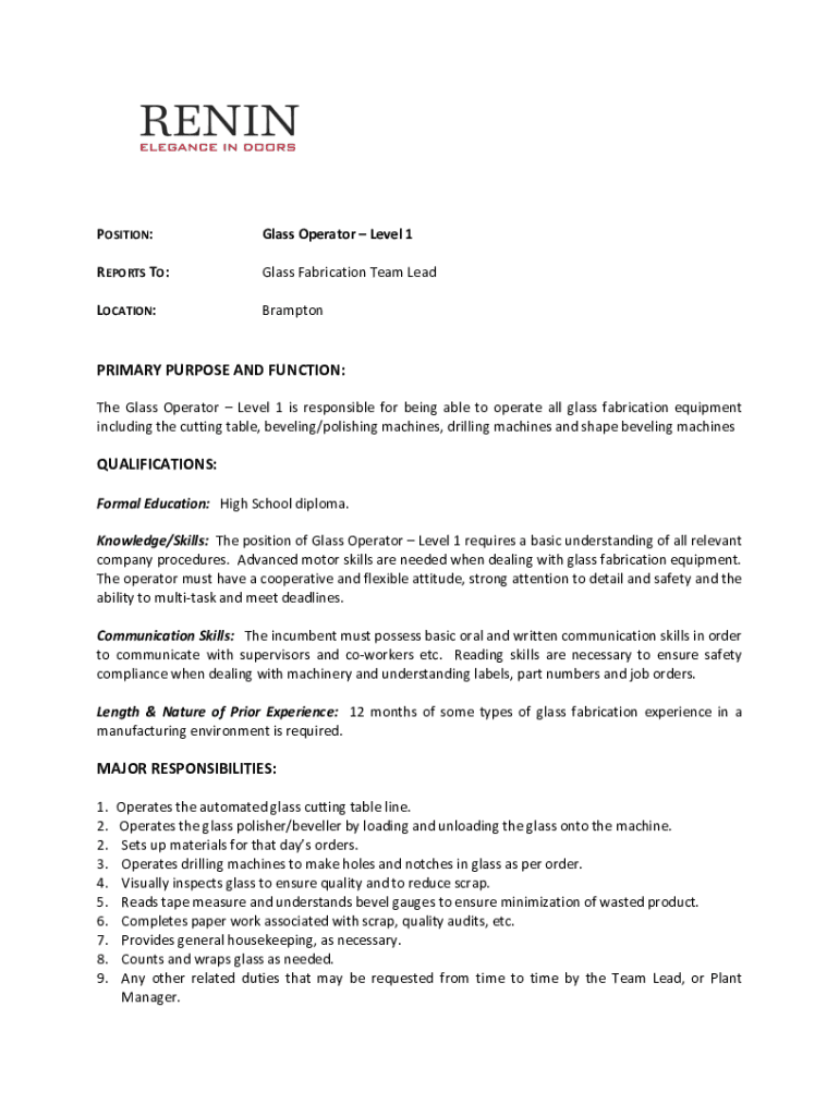 POSITION:Glass Operator Level 1REPORTS TO:Glass Fabrication Team LeadLOCATION:BramptonPRIMARY PURPOSE AND FUNCTION: The Glass Operator Level 1 is responsible for being able to operate all glass fabrication