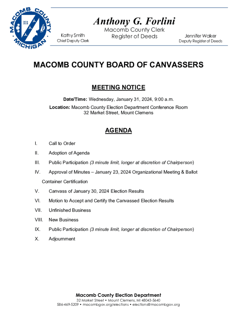 Anthony G. Forlini Kathy SmithChief Deputy ClerkMacomb County Clerk Register of DeedsJennifer WalkerDeputy Register of DeedsMACOMB COUNTY BOARD OF CANVASSERS MEETING NOTICE Date/Time: Wednesday, January