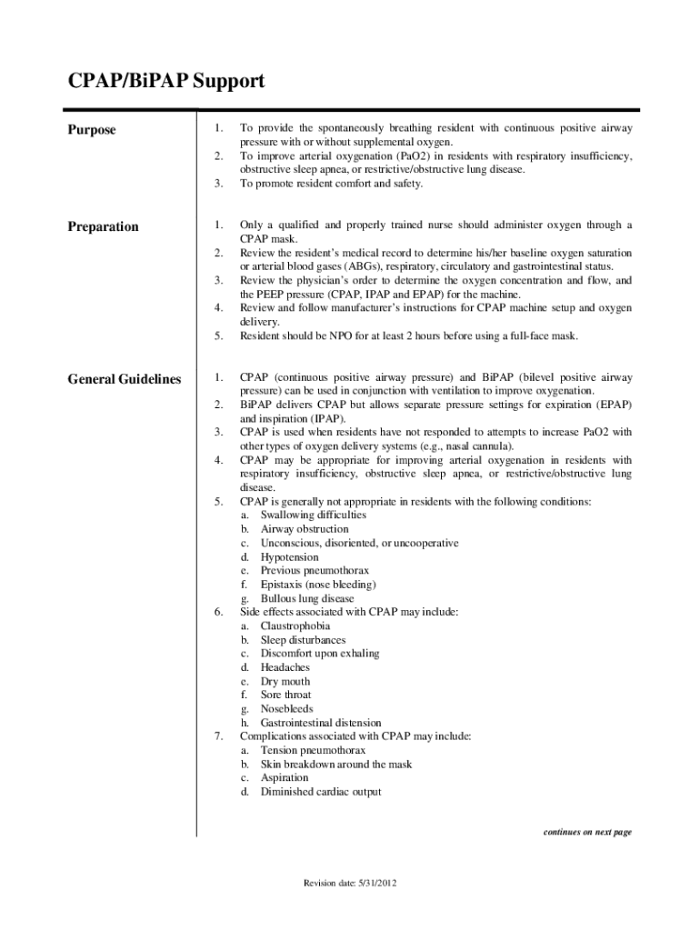 CPAP/BiPAP Support Purpose1. 2. 3.Preparation1. 2. 3. 4. 5.General Guidelines1. 2. 3. 4.5.6.7.To provide the spontaneously breathing resident with continuous positive airway pressure with or without