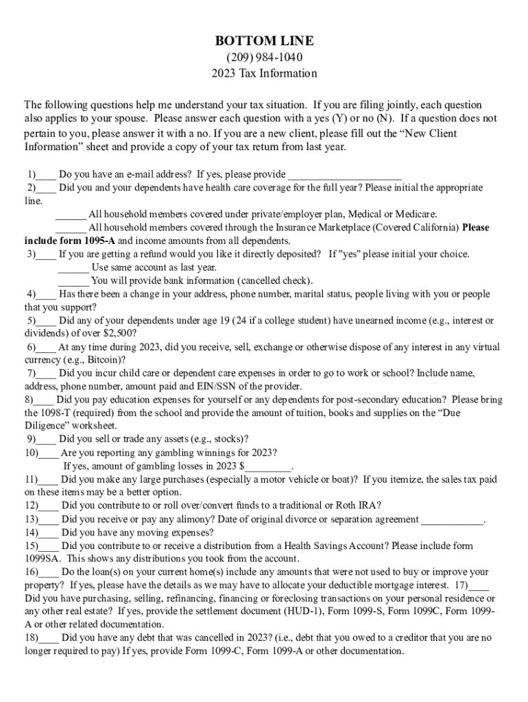 BOTTOM LINE (209) 9841040 2023 Tax Information The following questions help me understand your tax situation. If you are filing jointly, each question also applies to your spouse. Please answer each