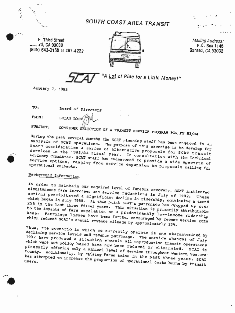 Get the free 1983 - Reports - CONSIDER SELECTION OF A TRANSIT SERVICE PROGRAM FOR FY 83/84. SCAT,...