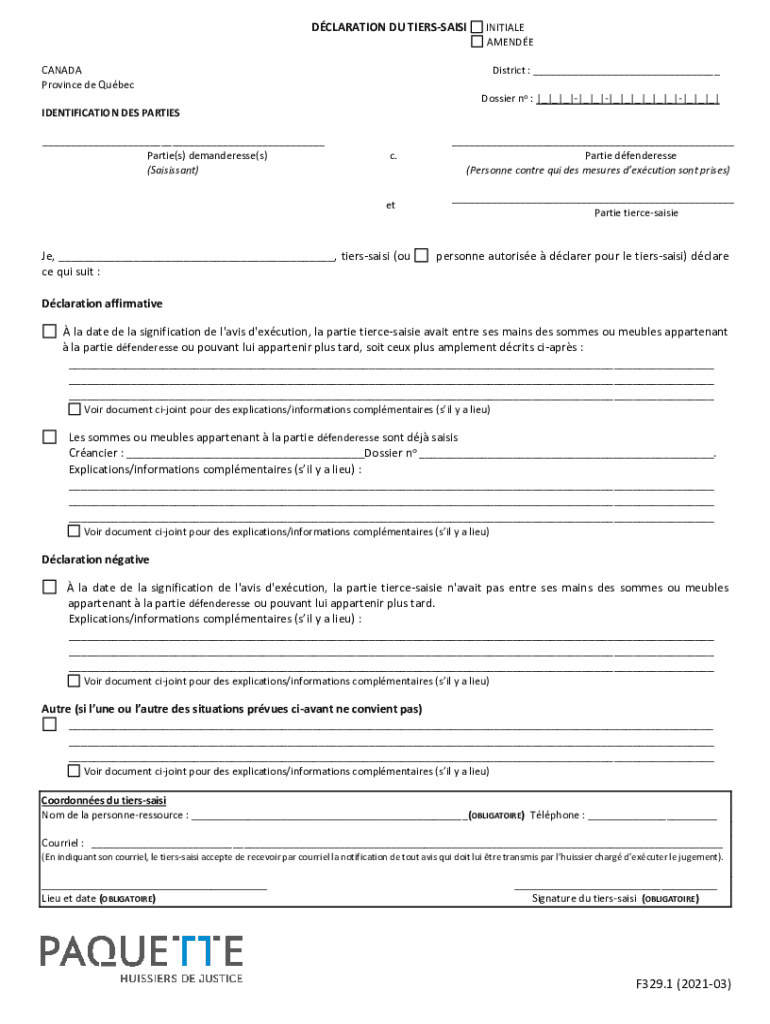 DCLARATION DU TIERSSAISIINITIALE AMENDECANADA Province de QubecDistrict : ___ Dossier no : |_|_|_||_|_||_|_|_|_|_|_||_|_|_|IDENTIFICATION DES PARTIES ___ Partie(s) demanderesse(s) (Saisissant)c.___