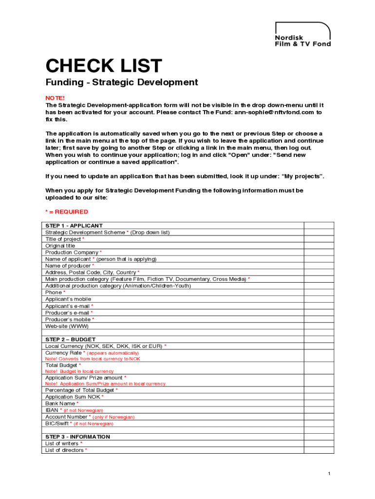 CHECK LIST Funding Strategic Development NOTE! The Strategic Developmentapplication form will not be visible in the drop downmenu until it has been activated for your account. Please contact The Fund: