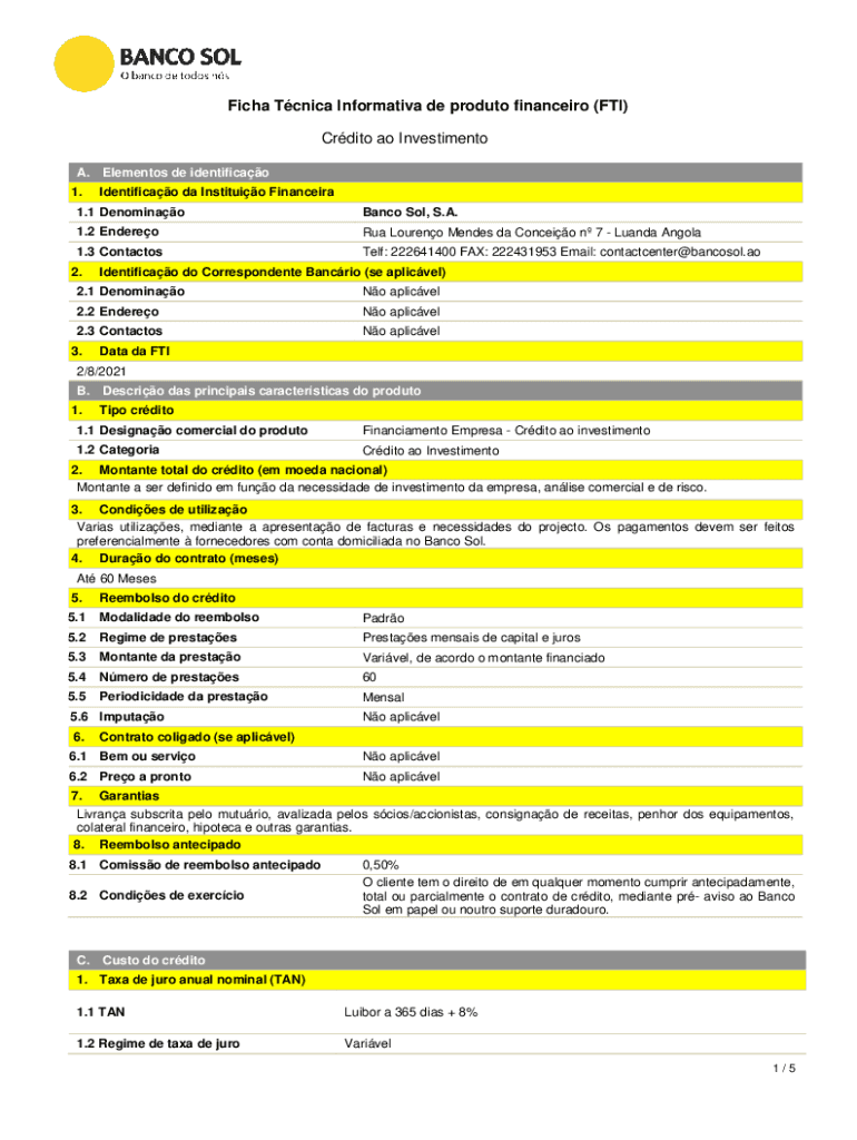 Ficha Tcnica Informativa de produto financeiro (FTI) Crdito ao Investimento A. 1.Elementos de identificao Identificao da Instituio Financeira1.1 DenominaoBanco Sol, S.A.1.2 EndereoRua Loureno Mendes
