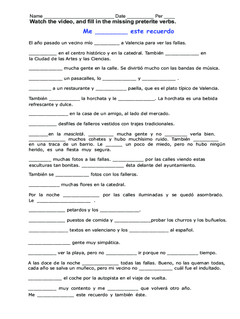 Name ___ Date ___ Per ___Watch the video, and ll in the missing preterite verbs.Me ___ este recuerdo El ao pasado un vecino mo ___ a Valencia para ver las fallas. ___ en el centro histrico y en la