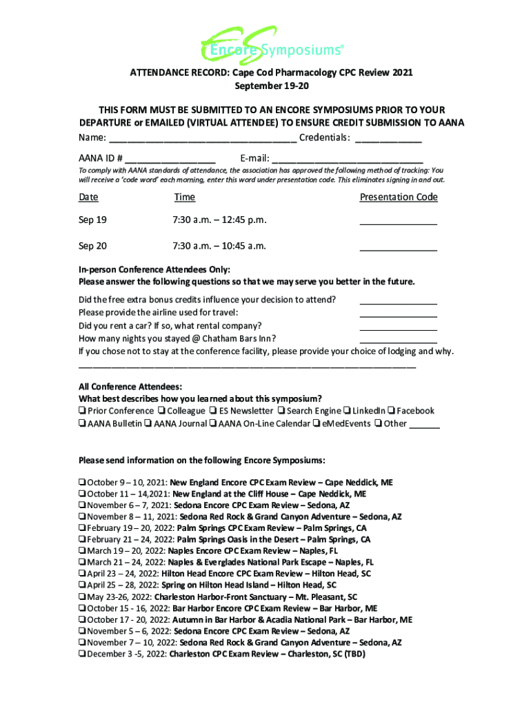 ATTENDANCE RECORD: Cape Cod Pharmacology CPC Review 2021 September 1920 THIS FORM MUST BE SUBMITTED TO AN ENCORE SYMPOSIUMS PRIOR TO YOUR DEPARTURE or EMAILED (VIRTUAL ATTENDEE) TO ENSURE CREDIT SUBMISSION