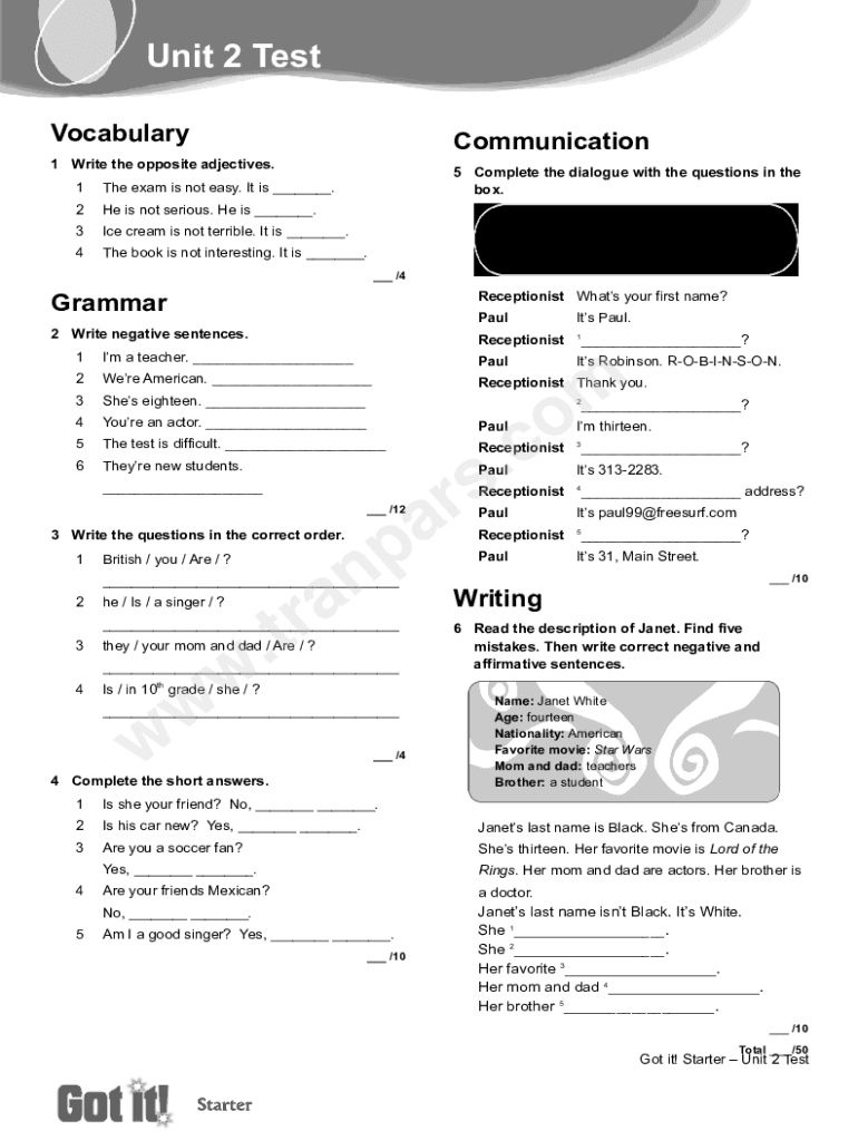 Unit 2 Test VocabularyCommunication1 Write the opposite adjectives.5 Complete the dialogue with the questions in the box.1The exam is not easy. It is ___.2He is not serious. He is ___.3Ice cream is