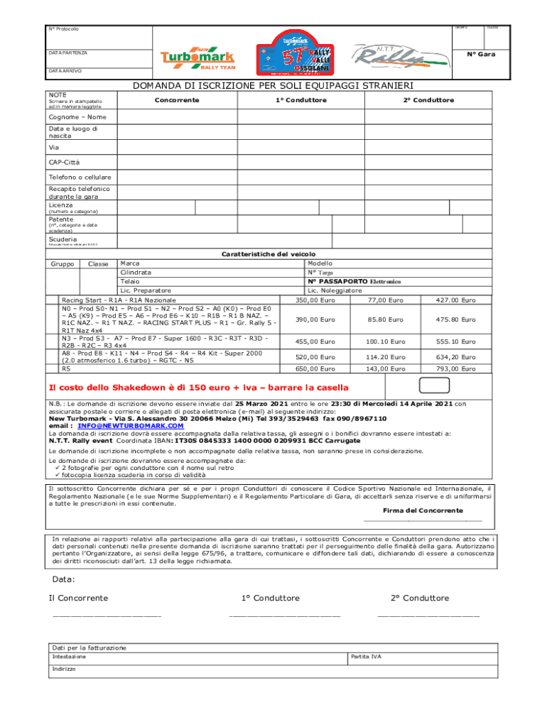 N ProtocolloGRUPPODATA PARTENZACLASSEN GaraDATA ARRIVODOMANDA DI ISCRIZIONE PER SOLI EQUIPAGGI STRANIERI NOTEConcorrenteScrivere in stampatello ed in maniera leggibile1 Conduttore2 ConduttoreCognome
