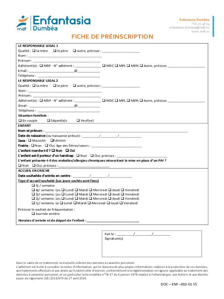 Enfantasia DumbaFICHE DE PRINSCRIPTIONTl. 72 48 04 enfantasiadumbea@mdf.nc www.mdf.ncLE RESPONSABLE LEGAL 1 Qualit : la mre le pre autre, prcisez : ___ Nom : ___ Prnom : ___ Adhrent(e) : MDF N adhrent