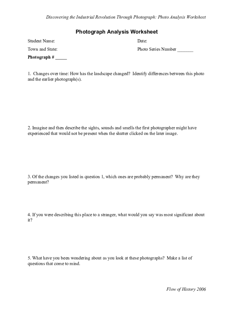 Discovering the Industrial Revolution Through Photograph: Photo Analysis WorksheetPhotograph Analysis Worksheet Student Name:Date:Town and State:Photo Series Number ___Photograph # ___ 1. Changes