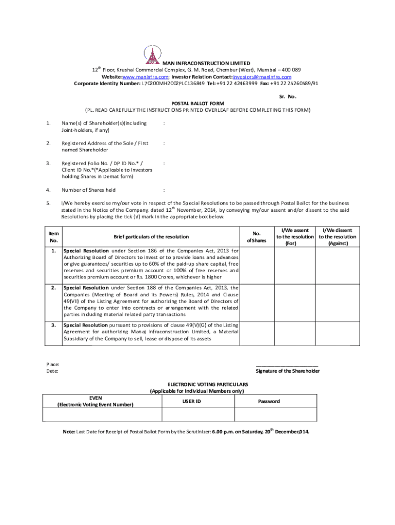 MAN INFRACONSTRUCTION LIMITED th 12 Floor, Krushal Commercial Complex, G. M. Road, Chembur (West), Mumbai 400 089 Website:www.maninfra.com; Investor Relation Contact:investors@maninfra.com Corporate