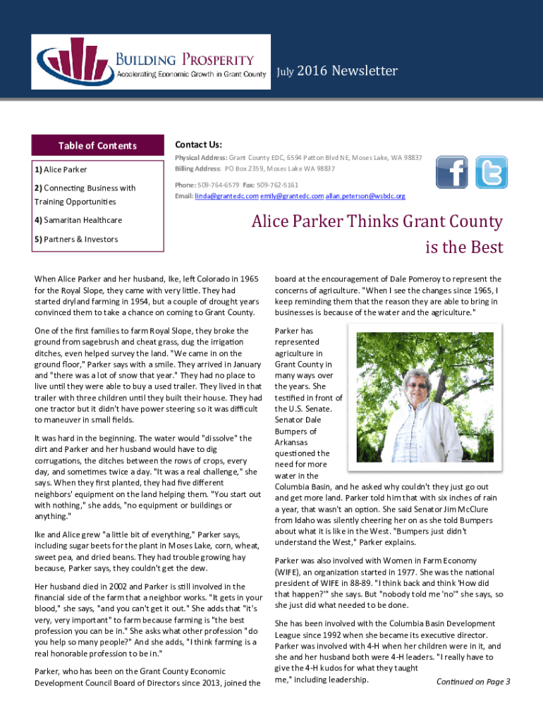 July 2016 NewsletterTable of Contents 1) Alice Parker 2) Connec ng Business with Training Opportuni es 4) Samaritan Healthcare 5) Partners & InvestorsContact Us: Physical Address: Grant County EDC,