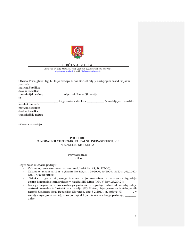 OBINA MUTA Glavni trg 17, 2366 Muta, tel.: +386 (0)2 8879600, fax: +386 (0)2 8879606 http://www.muta.si; email: obcina.muta@muta.siObina Muta, glavni trg 17, ki jo zastopa upan Boris Kralj (v nadaljnjem