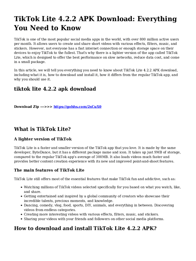 TikTok Lite 4.2.2 APK Download: Everything You Need to Know TikTok is one of the most popular social media apps in the world, with over 800 million active users per month. It allows users to create