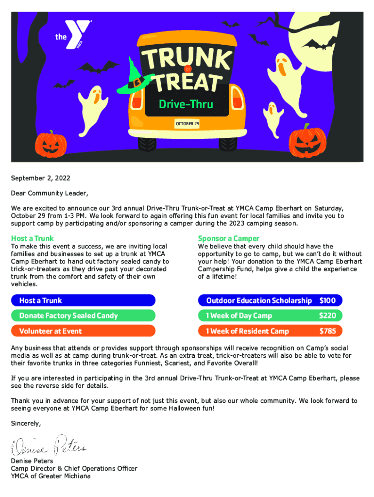 We are excited to announce our 3rd annual DriveThru TrunkorTreat at YMCA Camp Eberhart on Saturday,