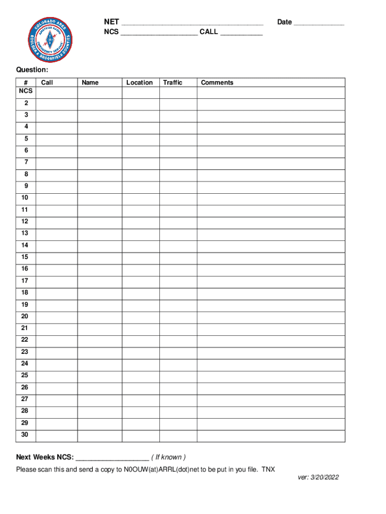 NET ___Date ___NCS ___ CALL ___Question: # NCSCallNameLocationTrafficComments2 3 4 5 6 7 8 9 10 11 12 13 14 15 16 17 18 19 20 21 22 23 24 25 26 27 28 29 30Next Weeks NCS: ___ ( If known ) Please scan