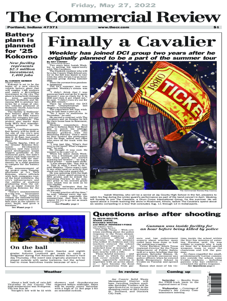 Friday, May 27, 2022The Commercial Review Portland, Indiana 47371Battery plant is planned for 25 Kokomo New facility represents $2.5 million investment, 1,400 jobs By CARSON GERBER Kokomo TribuneKokomo