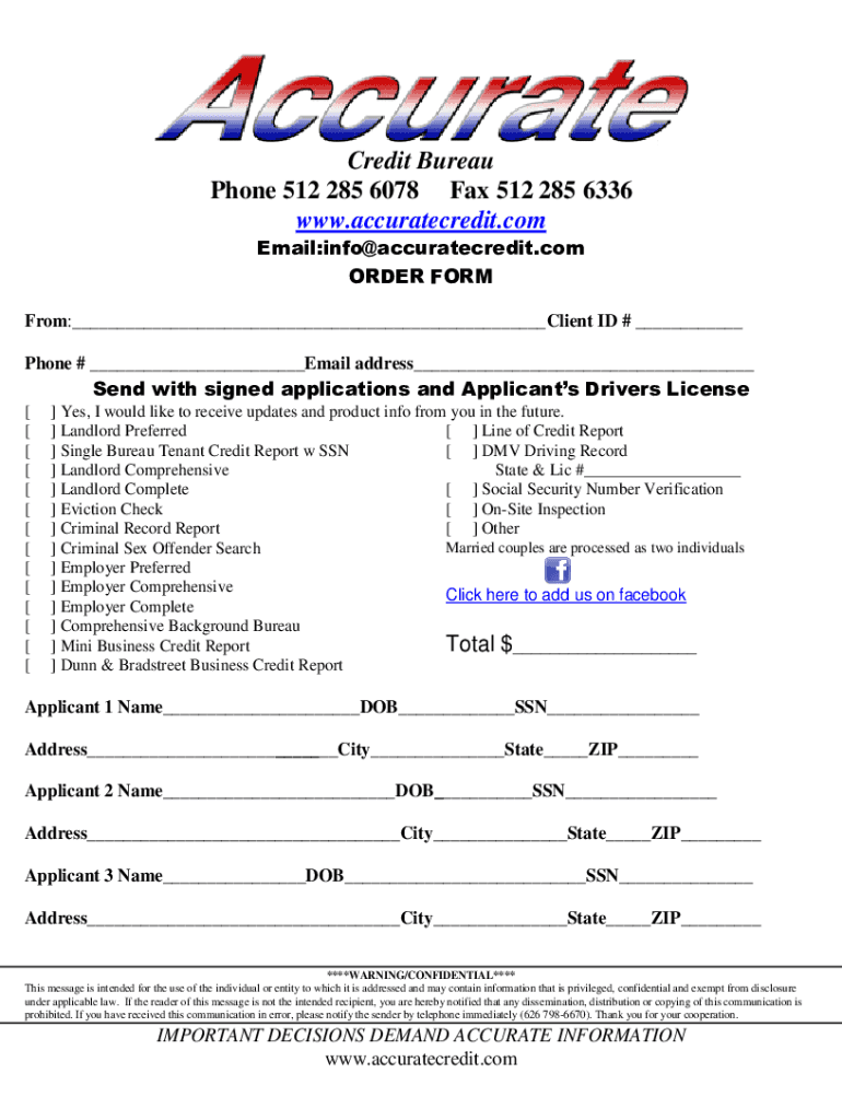 Credit Bureau Phone 512 285 6078 Fax 512 285 6336 www.accuratecredit.com Email:info@accuratecredit.com ORDER FORMFrom:___Client ID # ___ Phone # ___Email address___Send with signed applications and