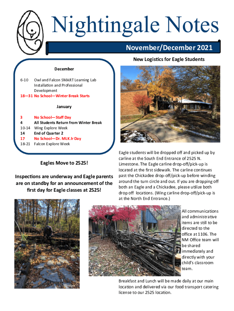 Nightingale Notes November/December 2021 New Logistics for Eagle Students December 610Owl and Falcon SMART Learning Lab Installation and Professional Development 1831 No SchoolWinter Break StartsJanuary
