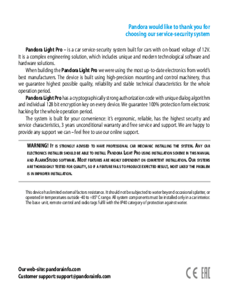 Pandora would like to thank you for choosing our servicesecurity system Pandora Light Pro is a car servicesecurity system built for cars with onboard voltage of 12V. It is a complex engineering solution,