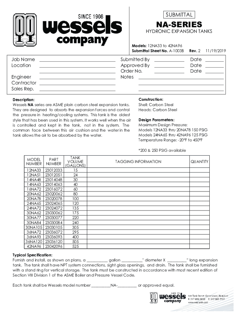 SUBMITTALNASERIESHYDRONIC EXPANSION TANKS Models: 12NA33 to 42NA96 Submittal Sheet No. A1003BJob Name ___ ___ Location ___ ___ Engineer Contractor ___ Sales Rep. ___Rev. 211/19/2019Submitted By ___
