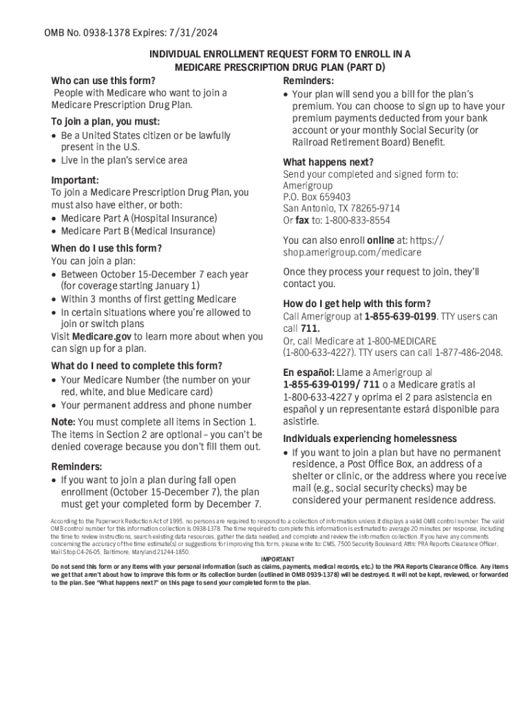 OMB No. 09381378 Expires: 7/31/2024 INDIVIDUAL ENROLLMENT REQUEST FORM TO ENROLL IN A MEDICARE PRESCRIPTION DRUG PLAN (PART D) Who can use this form? Reminders: People with Medicare who want to join