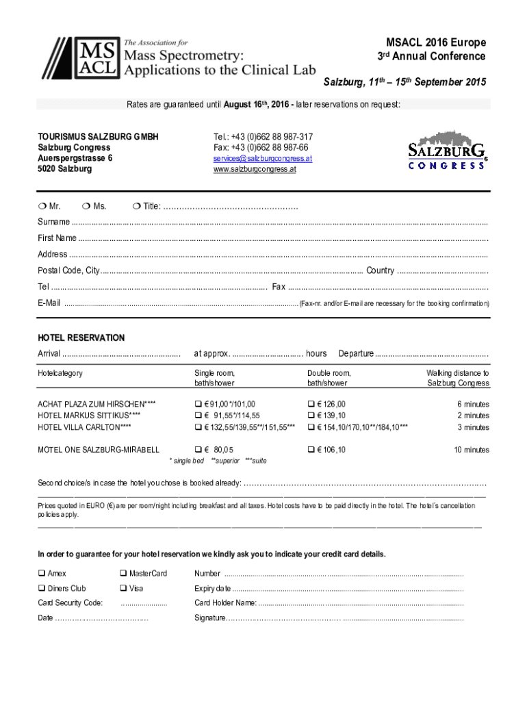 MSACL 2016 Europe 3rd Annual Conference Salzburg, 11th 15th September 2015 Rates are guaranteed until August 16th, 2016 later reservations on request: TOURISMUS SALZBURG GMBH Salzburg Congress Auerspergstrasse