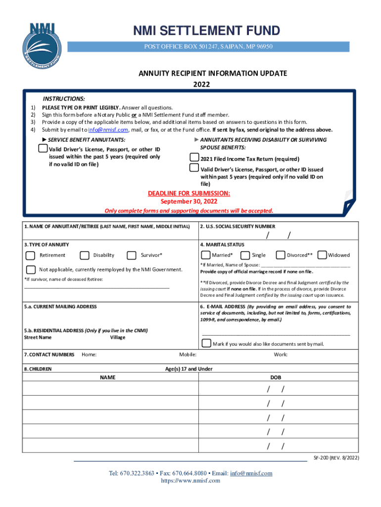 NMI SETTLEMENT FUND POST OFFICE BOX 501247, SAIPAN, MP 96950ANNUITY RECIPIENT INFORMATION UPDATE 2022 INSTRUCTIONS: 1) 2) 3) 4)PLEASE TYPE OR PRINT LEGIBLY. Answer all questions. Sign this form before