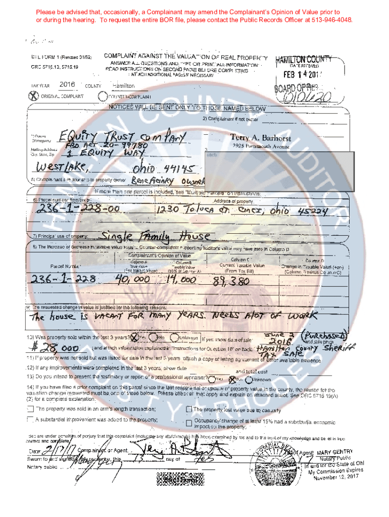 Please be advised that, occasionally, a Complainant may amend the Complainants Opinion of Value prior to or during the hearing. To request the entire BOR file, please contact the Public Records Officer