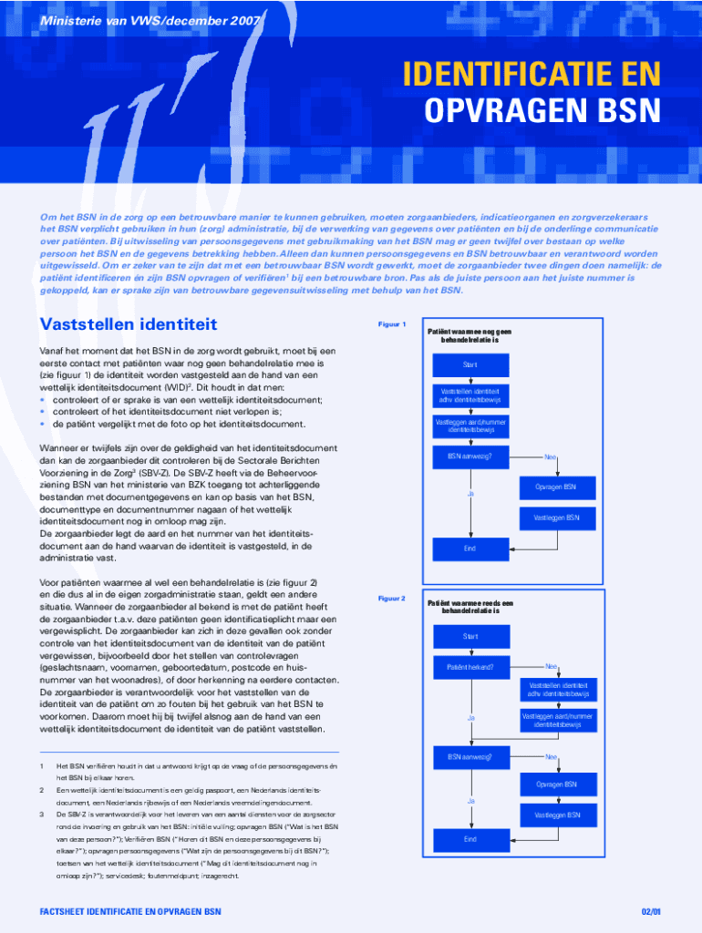 Ministerie van VWS/december 2007IDENTIFICATIE EN OPVRAGEN BSN Om het BSN in de zorg op een betrouwbare manier te kunnen gebruiken, moeten zorgaanbieders, indicatieorganen en zorgverzekeraars het BSN