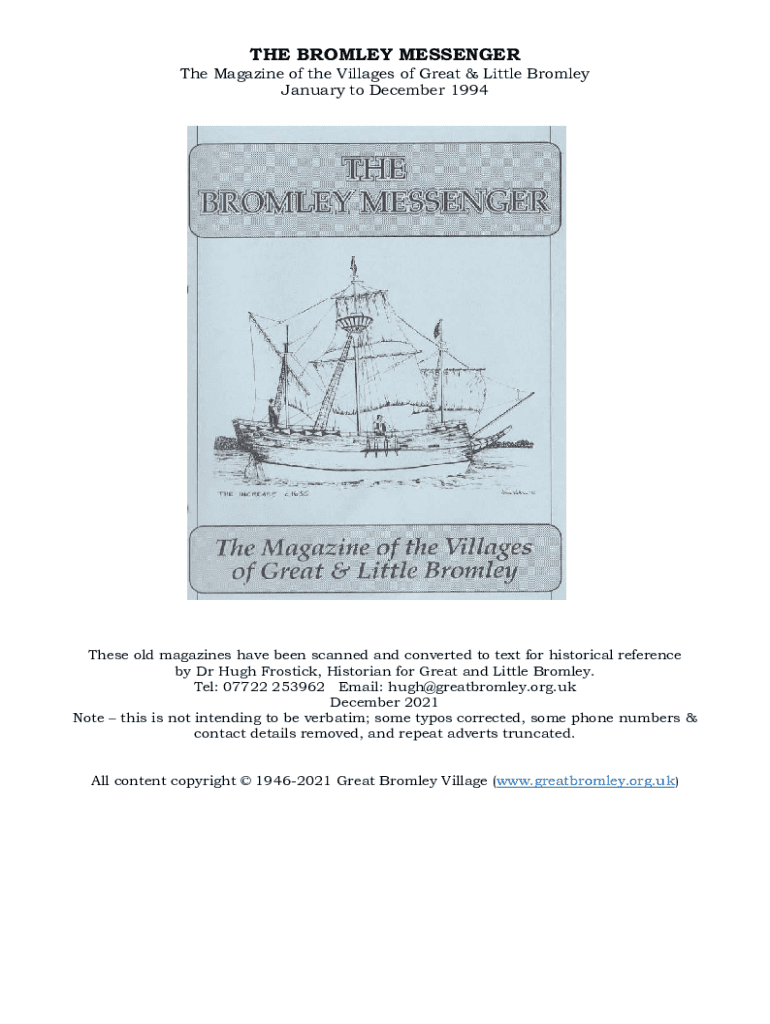 THE BROMLEY MESSENGER The Magazine of the Villages of Great & Little Bromley January to December 1994These old magazines have been scanned and converted to text for historical reference by Dr Hugh
