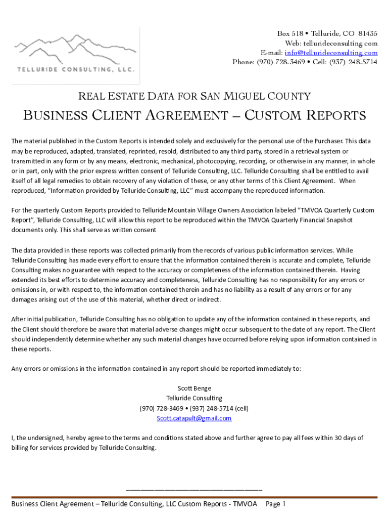 Box 518 Telluride, CO 81435 Web: tellurideconsulting.com Email: info@tellurideconsulting.com Phone: (970) 7283469 Cell: (937) 2485714REAL ESTATE DATA FOR SAN MIGUEL COUNTYBUSINESS CLIENT AGREEMENT